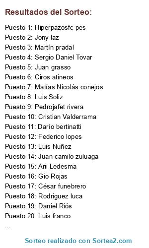 Lista de participantes: Martín pradal, César funebrero, Matías barbero, Gustavo padilla zamorano, Fernando silva, Xavy veloz, Fede v. González, Jorge edu, Rodriguez luca, Ciros atineos, Francisco torres, Persingola jorge Daniel, Gian xeneize, Juan grasso, José filiau, Luis Soliz, Iván argomedo, Darío bertinatti, Federico javier, Luciano robles, Juan camilo zuluaga, Pablo Leonel, Federico rueda leal, Omar Ruiz Díaz, Nicolás Sáez parra, Rodrigo segura padilla, Jony laz, Fede Muñoz pes, Facundo tapia oppe, Hiperpazosfc pes, Kametaro masamoto, Pablo marquez, Darío Ezequiel, Baena luis, Matías Nicolás conejos, Mauro sampetaz, Wilfredo vargas badilla, Diego franco, Cristian sanabria, Fernando Cortez Cuba, Sebastián Gutiérrez Morales, Sergio Daniel Tovar, Pedrojafet rivera, Federico loto, Damian jara, Edwin León, Daniel Riós, Gio Rojas, Gabi HaedoKurz bazan, Claudio Peppers, Roberto medina, Gustavo Olmedo, Wilson Quiroz Aguilera, Lionel Kaminski, Cristian Valderrama, Gui rossener, Carlos Fleitas, Alejo Molina, Matías alejandro Nagy, Diego del Valle, Fernando dirzu, Camilo mazu, Luis Nuñez, Gonzalo genovesio, Fran Carp, Arii Ledesma, Maxi Iván, Mariano López, Alan Ken, Ariel Salvi, Ezequiel Juárez, Osvaldo Frank, Nicolas Alvarado Iturriaga, Matías Pérez el porteño, Gonza akd Ontiveros, Santi Villalba, Roguer Caamaño Contreras, Jhonnatan Eduardo cht, Luis franco, Bulla pes, Federico lopes.
