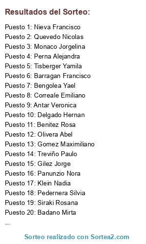 Lista de participantes: Acosta Silvana, Albornoz Cristina (5 participaciones), Alvear Maria Rosa, Amato Marina (4 participaciones), Antar Veronica (2 participaciones), Arnosi Cristian, Badano Mirta (5 participaciones), Balleto Graciela, Barbieri Diego, Barragan Francisco (4 participaciones), Barroso Fabian, Basso Ruben (2 participaciones), Battegazore Gabriela, Bebilaqua Mabel, Bengolea Yael (2 participaciones), Benitez Rosa (4 participaciones), bordon nicolas, Caceres Nilda (2 participaciones), Campos Hilda, Carusso Cristina, Castillo Mario (3 participaciones), Castro Agustin, Castro Marcela, Chevriau Nora (3 participaciones), Chimino Aldy, Chiodo Federico, Collaso Laura, Comité Mauricio, Correale Emiliano (4 participaciones), Cross Yessica (3 participaciones), Darre Agustina (4 participaciones), Darre jeremias, De Diego Patricio, Delgado Fernanda (2 participaciones), Delgado Hernan (5 participaciones), Diaz Carlos (2 participaciones), Dure Luciano (2 participaciones), Escarso Esteban, Escudero Marcos, Faber Victor (2 participaciones), Ficoseco Maria (2 participaciones), Filipoli Nerina (5 participaciones), Fredes Norma (2 participaciones), Gallardo Daiana, Garcia Stella (3 participaciones), Gasca Daniel, Gentile Gabriela, Gilez Jorge (4 participaciones), Golini Andy (2 participaciones), Gomez Lorena (2 participaciones), Gomez Maximiliano (4 participaciones), Gomez Tamara (4 participaciones), Gonzalez Carlos, Gonzalez Dora (5 participaciones), Gonzalez Soledad, Gonzalez Victoria, Guruvich Andres (3 participaciones), Guzman Monica (4 participaciones), Hernan Carolina (2 participaciones), Hernandez Valeria (2 participaciones), Herrera Daniel, Journé Stella Maris, Juliano Vanesa, Klein Nadia (4 participaciones), Lavalle Adrian (4 participaciones), Lopez Marcela, Lujan Maria Ester, Martinez Josefina, Martinez Monica, Mazzina Sebastian (3 participaciones), Medina Raul, Miguez Marcela (2 participaciones), Monaco Jorgelina, Musso Brenda (4 participaciones), Navarro Diego (3 participaciones), Nieva Francisco (3 participaciones), Nieva Yolanda (2 participaciones), Olivera Abel (2 participaciones), Panunzio Nora, Pedatela Matias, Pedernera Silvia (5 participaciones), Peñaloza Claudia, Perez Beatriz (5 participaciones), Perna Alejandra (2 participaciones), Pintos Marcelo, Quevedo Nicolas (2 participaciones), Quintana Liliana, Rasente Jorgelina, Ravena Xoana (3 participaciones), Ridella Laura (2 participaciones), Roble Mercedes (4 participaciones), Rodriguez Cristian (2 participaciones), Ruggiero Ana (4 participaciones), Ruiz Claudio (3 participaciones), Saguas Natalia, Sanchez Eduardo (3 participaciones), Scarnatto Soledad, Schvindt Marcela, Siraki Rosana (4 participaciones), Suarez Ana, Tisberger Loreley, Tisberger Nerina, Tisberger Yamila (2 participaciones), Torres Lidia (4 participaciones), Treviño Paulo, Vera Carmen (2 participaciones), Verger Samanta (2 participaciones), Vichiarino Laura (5 participaciones), Zanetti Adelma.