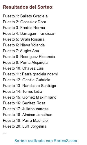 Lista de participantes: Albornoz Cristina (3 participaciones), Almiron Jonathan, Altamirano Patricia, Alvarado Rocio (2 participaciones), Alvarado Veronica, Alvear Maria Rosa, Amato Marina (3 participaciones), Arnosi Cristian (4 participaciones), Augier Ana (5 participaciones), Badano Mirta (2 participaciones), Baffa Martin, Balleto Graciela (2 participaciones), Barragan Francisco (2 participaciones), Barroso Fabian, Basso Ruben (3 participaciones), Benitez Rosa (3 participaciones), Bilotto Emilia, Bustamante Silvia, Campos Hilda, Carusso Cristina (3 participaciones), Castillo Mario (4 participaciones), Castro Agustin, Castro Marcela (2 participaciones), Cendali Vanesa (5 participaciones), Chavez Luis, Chevriau Nora (5 participaciones), Chiodo Federico (2 participaciones), Comité Mauricio (4 participaciones), Correale Emiliano (4 participaciones), Delgado Hernan (2 participaciones), Diaz Carlos (2 participaciones), Escudero Marcos, Fernandez Laura (2 participaciones), Filipoli Nerina (4 participaciones), Fredes Norma (3 participaciones), Gentile Gabriela, Gomez Maximiliano (5 participaciones), Gonzalez Dora (3 participaciones), Gonzalez Soledad, Gonzalez Victoria, Guzman Monica (2 participaciones), Hernan Carolina (3 participaciones), Journé Stella Maris (2 participaciones), Juliano Vanesa (2 participaciones), Lavalle Adrian (4 participaciones), Lopez Alejandra (2 participaciones), Lopez Marcela, Luffi Jorgelina (3 participaciones), Manfredo Beti, Mazzina Sebastian, Medina Raul, Melo Eduardo, Miguez Marcela (5 participaciones), Navarro Diego (2 participaciones), Nieva Francisco (3 participaciones), Nieva Yolanda (2 participaciones), Parra graciela noemi, Parra Mauricio, Pedernera Silvia, Perez Beatriz, Perna Alejandra (3 participaciones), Pino Sofia, Pintos Marcelo (3 participaciones), Quevedo Nicolas (3 participaciones), Quintana Liliana (2 participaciones), Randazzo Santiago (5 participaciones), Ridella Laura (2 participaciones), Rodriguez Florencia (2 participaciones), Romero Fabiana, Ruggiero Ana (3 participaciones), Ruiz Claudio (2 participaciones), Sanchez Eduardo, Scarzo Isabel, Siraki Rosana (3 participaciones), Strigari Sofia (2 participaciones), Torres Lidia (2 participaciones), Torres Lidia.