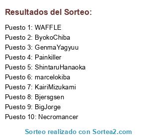 Lista de participantes: KairiMizukami(3), Painkiller(2), GenmaYagyuu(2), BigJorge(2), marcelokiba(4), ByokoChiba(1), Bjersgsen(1), Necromancer(1), LDBM(1), BorutoUchiha(1), WAFFLE(3), ShintaruHanaoka(2), NotDark(5), GuayaSensei(1).