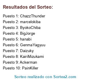 Lista de participantes: Daizuky(3), KairiMizukami(2), PainKiller(2), hanabi(3), GenmaYagyuu(2), Bjersgsen(2), BigJorge(2), Radamanthis(2), LUCIAN(2), pepeross(1), ByokoChiba(1), marcelokiba(2), ChazzThunder(1), Ackerman(2).