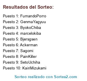 Lista de participantes: Sagomi(4), KairiMizukami(4), ByokoChiba(4), SetoUchiha(4), GenmaYagyuu(4), Bjersgsen(4), Ackerman(5), FumandoPorro(3), PainKiller(2), Diecuz(2), marcelokiba(2).