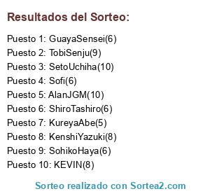 Lista de participantes: Sagomi(10), AjmS(12), SetoUchiha(10), NotDark(7), BorutoUchiha(7), Bjersgsen(8), TobiSenju(9), ShiroTashiro(6), Jusuork(11), Iwabee(10), AlanJGM(10), galatai(7), Sinofukuda(9), ByokoChiba(6), NomeDoomXD(6), Aníbal(5), oscar(10), SohikoHaya(6), Sofi(6), KenshiYazuki(8), Daizuky(6), NarutoAkazawa(9), Ackerman(7), leviatan(4), kakaske(7), itachiuchiha(7), Watermelon(5), KureyaAbe(5), KEVIN(8), GuayaSensei(6), puchamon(7), frikiandres(4), KaguraUzuki(3), Erza(3).