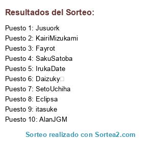 Lista de participantes: Sagomi(15), KairiMizukami(13), DORAEMONSEVILLA(7), Eclipsa(11), Daizuky (15), Jusuork(11), NotDark(5), Bjersgsen(13), AlanJGM(12), BryanUchiha(12), galatai(5), RileyReid(7), KenshiYazuky(7), Fayrot(6), Diecuz(11), juanpro(6), SetoUchiha(4), FunaKitano(7), Anibal(9), IrukaDate(8), Ajms(9), ShiroTashiro(4), hanabi(4), Otsusuki(5), Janet(8), marcelokiba(4), leviatan(5), GuayaSensei(7), Ackerman(8), oscar(8), itasuke(12), elmejor(5), URIEL205(11), SakuSatoba(5), KEVIN(5), JesusUchaki(11), Ignabui(6), Cristopher(10), SakuHyuga(8).
