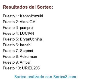 Lista de participantes: Ackerman(9), AjmS(13), AlanJGM(15), Anibal(13), BryanUchiha(17), Daizuky(7), Eclipsa(6), Fayrot(6), GuayaSensei(12), hanabi(6), IrukaDate(4), juanpro(7), Jusuork(8), KairiMizukami(5), KenshiYazuki(10), KEVIN(6), LUCIAN(3), marcelokiba(5), NotDark(9), puchamon(7), RileyReid(9), Sagomi(19), SetoUchiha(5), ShiroTashiro(3), SuiroUchiha(3), TobiSenju(7), tobisensei(3), URIEL205(12).