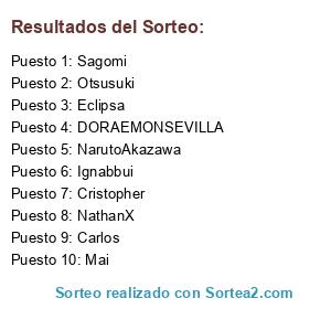 Lista de participantes: AjmS(5), Anibal(17), Carlos(10), Cristopher(8), diegost327(1), DORAEMONSEVILLA(39), Eclipsa(15), Fayrot(9), galatai(5), Ignabbui(8), Jusuork(15), KEVIN(12), Mai(7), marcelokiba(12), NarutoAkazawa(6), NathanX(6), NotDark(5), Otsusuki(21), pepeross(3), puchamon(4), Sagomi(7), SetoUchiha(13), ShiroTashiro(6), stein(10), TobiSenju(6).