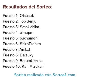 Lista de participantes: Ackerman(5), AjmS(12), AlanJGM(4), Anibal(28), Bjersgsen(5), BorutoUchiha(7), Daizuky(7), diegost327(1), elmejor(4), Espartaco(2), Fayrot(18), galatai(11), GuayaSensei(4), IrukaDate(5), KairiMizukami(3), KenshiYazuki(5), leviatan(7), marcelokiba(15), Otsusuki(26), pepeross(10), puchamon(7), Raikage(7), SetoUchiha(21), ShiroTashiro(15), stein(16), TobiSenju(16).