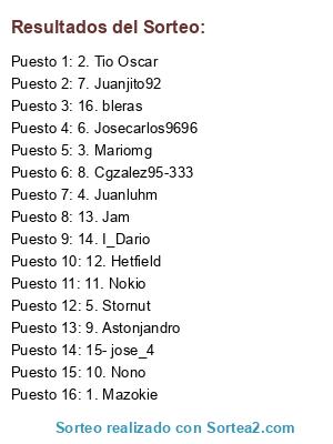 Lista de participantes: 1. Mazokie, 2. Tio Oscar, 3. Mariomg, 4. Juanluhm, 5. Stornut, 6. Josecarlos9696, 7. Juanjito92, 8. Cgzalez95-333, 9. Astonjandro, 10. Nono, 11. Nokio, 12. Hetfield, 13. Jam, 14. I_Dario, 15- jose_4, 16. bleras.