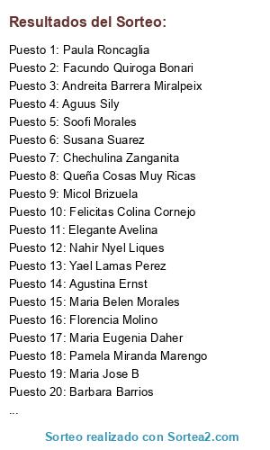 Lista de participantes: Graciela Quipildor(2 participaciones), Nataly Flores(2 participaciones), Chechulina Zanganita(2 participaciones), Andreita Barrera Miralpeix(2 participaciones), Nico Santillan(2 participaciones), Barbara Barrios(2 participaciones), Soofi Morales(2 participaciones), Fernanda Ardaya(2 participaciones), Maria Belen Morales(2 participaciones), Aguus Sily(2 participaciones), Alicia Isabel Alvarez(2 participaciones), Florencia Molino(2 participaciones), Silvana Sanchez(2 participaciones), Sol Castiella(2 participaciones), Cecilia Aguero(2 participaciones), Paula Roncaglia(2 participaciones), Irene Cruz(2 participaciones), Pamela Miranda Marengo(2 participaciones), Felicitas Colina Cornejo(2 participaciones), Agustina Ernst(2 participaciones), Maria Eugenia Daher(2 participaciones), Nahir Nyel Liques(2 participaciones), Facundo Quiroga Bonari(2 participaciones), Maria Jose B(2 participaciones), Elegante Avelina(2 participaciones), Micol Brizuela(2 participaciones), Flor Abril Abán(2 participaciones), Queña Cosas Muy Ricas(2 participaciones), Andrea Olivera(2 participaciones), Mónica Neme(2 participaciones), Yael Lamas Perez(2 participaciones), Luchii Celeste(2 participaciones), Susana Suarez(2 participaciones).
