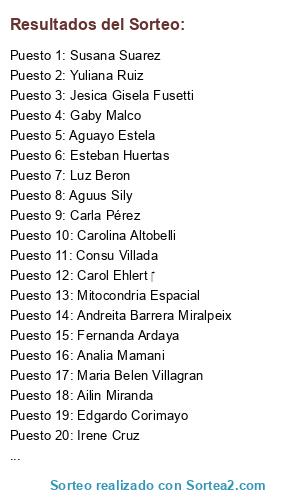 Lista de participantes: Yanii Cja(2 participaciones), Mitocondria Espacial(2 participaciones), Luchii Celeste(2 participaciones), Carol Ehlert (2 participaciones), Emii Mec(2 participaciones), Esteban Huertas(2 participaciones), Mar Sol(2 participaciones), Analia Mamani(2 participaciones), Joel Villegas(2 participaciones), Yuliana Ruiz(2 participaciones), Gaabyy Neegriitaa Cja(2 participaciones), Cecilia Aguero(2 participaciones), Emilio Martín Sisterna(2 participaciones), Luz Beron(2 participaciones), Aguayo Estela(2 participaciones), Edgardo Corimayo(2 participaciones), Irene Cruz(2 participaciones), Jesica Gisela Fusetti(2 participaciones), Aguus Sily(2 participaciones), Fernanda Ardaya(2 participaciones), Ailin Miranda(2 participaciones), Micaela Silvina Quiroz Licuime(2 participaciones), Carolina Altobelli(2 participaciones), Carla Pérez(2 participaciones), Ariel Echenique(2 participaciones), Consu Villada(2 participaciones), Maria Belen Villagran(2 participaciones), Andreita Barrera Miralpeix(2 participaciones), Susana Suarez(2 participaciones), Gaby Malco(2 participaciones), Mariela Palomino(2 participaciones).