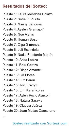 Lista de participantes: I-Locks Jonii(10 participaciones), Belen Gonzalez (10 participaciones), Gri Flores(10 participaciones), Claudia Marcela Pastrana(10 participaciones), Carlos Perez(10 participaciones), Patricio Tilca(10 participaciones), Luu Caldez(10 participaciones), Hernan Sosa(10 participaciones), Fran Kito Jey Wazowski(10 participaciones), Matías Figueroa(10 participaciones), Nanny Sandoval(10 participaciones), Lourdes Mariel Brito(10 participaciones), Belu Carrizo(10 participaciones), Ines Finetti(10 participaciones), Laura Rojas(10 participaciones), Adry Osa S(10 participaciones), Brenda Valerga(10 participaciones), Enzo Alvarez(10 participaciones), Nan Arias(10 participaciones), Daniel Salva(10 participaciones), Claudia Juárez(10 participaciones), Sofía G. Zurita(10 participaciones), Andreaa Guerrero(10 participaciones), Marisa Lopez(10 participaciones), Alicia Sutar(10 participaciones), Ana Luisa Daher(10 participaciones), Florchu Palomino(10 participaciones), Luz Beron(10 participaciones), Andres Galvan Garcia(10 participaciones), Cintia Ibarrarán(10 participaciones), Rocio Sangueso(10 participaciones), Clauu Mendiolaza(10 participaciones), Raquel Rodriguez(10 participaciones), Antonella Sorrentino(10 participaciones), Nadia Estefanía Martín(10 participaciones), Rodrigo Matias Brizuela(10 participaciones), Juan Matias Causarano(10 participaciones), Coquito Ma(10 participaciones), Pablo Tala(10 participaciones), Juli Espindola(10 participaciones), Carlos Arangio(10 participaciones), Fernanda Ardaya(10 participaciones), Luis Alberto Guantay Castro (10 participaciones), Gab Flores A(10 participaciones), Claudia Frias(10 participaciones), Mariana Zurita(10 participaciones), Lau Ra(10 participaciones), Mika González(10 participaciones), Natalia Saravia(10 participaciones), Rochi Grafinger(10 participaciones), Anita Loaiza(10 participaciones), Maxi Castillo(10 participaciones), Laura Mendoza Colazo(10 participaciones), Anita Tortorici Marañon(10 participaciones), Gise Mont(10 participaciones), Marcela Viveros(10 participaciones), Ignacio Humano(10 participaciones), Diego Holmes(10 participaciones), Felipe Miguel Pardo(10 participaciones), Ralf Frias(10 participaciones), Mariie Lizz(10 participaciones), Jesica Juarez(10 participaciones), Olga Gimenez(10 participaciones), Jovi Frenyx(10 participaciones), Emilia Riquelme (10 participaciones), Adriana Castillo(10 participaciones), Natalia Osinaga(10 participaciones), Pedro Hernandez(10 participaciones), Irene Cruz(10 participaciones), Alee Figueroa(10 participaciones), Jesy Contreras(10 participaciones), Emi Karanicolas(10 participaciones), Diego Amante(10 participaciones), Marcelo Berruezo(10 participaciones), Ricky Lopez Paroni (10 participaciones), Paula Roncaglia(10 participaciones), Beatriz Elizabeth Olivera(10 participaciones), Aylen Rocio Alarcon(10 participaciones), Hector L. Alarcon(10 participaciones), Sole Salas de Massie(10 participaciones), Martín Clérico(10 participaciones), Ayelen Gramajo (10 participaciones), Natalia Chavarria(10 participaciones), Noe Alanis(10 participaciones), Jonass Assad(10 participaciones).