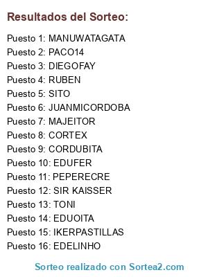 Lista de participantes: PACO14, JUANMICORDOBA, PEPERECRE, EDUFER, DIEGOFAY, SIR KAISSER, CORDUBITA, MANUWATAGATA, CORTEX, SITO, EDELINHO, MAJEITOR, TONI, RUBEN, EDUOITA, IKERPASTILLAS.