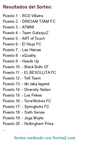 Lista de participantes: - Army Warriors, - Los Velis FC, - Black Bulls CF, - Spanish Style, - Follatores CF, - GoldenSpain FC, - Always WS, - ATM88, - Tops Abreu FC, - Pituarise Fc, - SPAIN FOX UNIT, - CaeluM FC, - Joga Mojito, - VendaBALL FC, - FC Mayango, - Eleven Warriors, - Imperium FC, - El Niupi FC, - Las Hienas, - Springboks FC, - Nottingham Prisa, - Zafra United, - Patriots Soccer, - Futbol Lindo, - Ragnarokcf, - FyfaLeagueFC, - TorreWolves FC, - DRE3AM T3AM FC, - Olympus FC, - TDS PTS FC, - Toca y Vete FC, - ART of Touch, - LOSDEMARRAS F.C, - Dark Warriors, - xQuality, - Team GalaxyzZ, - RCD Villains, - Hispania CF, - FreeStyle Squad, - Cpf Idea, - The Spain Stars, - EL BESOLLITA FC, - Sr Mortred, - Diversity Nation, - TsK Team, - Heads Up, - Sixth Sense, - Inter Gamers fc, - Sport Timbers, - Proleague FC, - InTheSky, - tiki taka legend, - Luxury Gold, - AVANTE CF, - F.C. Compitruenos, - Los Pekes, - Al Andaluz F.C., - Canary Stars, - Los Cyborgs.