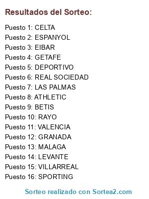 Lista de participantes: ATHLETIC, GETAFE, GRANADA, LEVANTE, MALAGA, RAYO, BETIS, CELTA, DEPORTIVO, ESPANYOL, SPORTING, EIBAR, LAS PALMAS, REAL SOCIEDAD, VALENCIA, VILLARREAL.