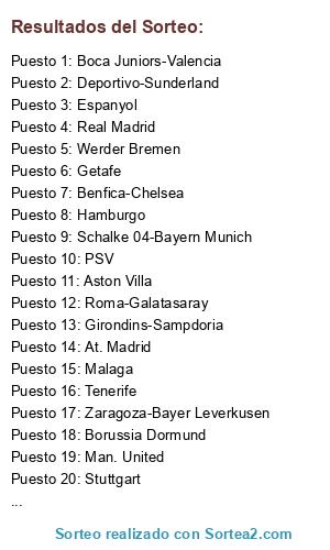 Lista de participantes: Oporto, Stuttgart, Sporting-Fenerbahçe, At. Madrid, Schalke 04-Bayern Munich, Sevilla, Sporting Lisboa, Getafe, Zaragoza-Bayer Leverkusen, Real Madrid, Benfica-Chelsea, Everton, Boca Juniors-Valencia, Girondins-Sampdoria, Werder Bremen, Borussia Dormund, PSV, Espanyol, Man. City-Inter Milan, Tenerife, Athletic Bilbao, Roma-Galatasaray, Aston Villa, Milan, Deportivo-Sunderland, Hamburgo, Wolfsburgo, Internaconal, Villarreal, Ajax, Malaga, Man. United.