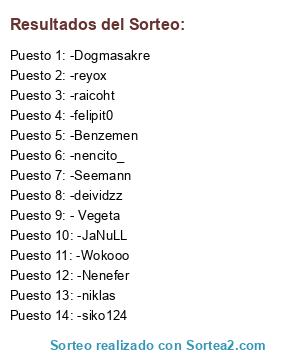 Lista de participantes: -JaNuLL, - Vegeta, -raicoht, -Seemann, -Wokooo, -Benzemen, -felipit0, -deividzz, -Dogmasakre, -Nenefer, -nencito_, -reyox, -siko124, -niklas.