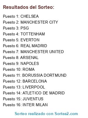 Lista de participantes: ATLETICO DE MADRID, JUVENTUS, BORUSSIA DORTMUND, ARSENAL, REAL MADRID, PSG, MANCHESTER CITY, NAPOLES, MANCHESTER UNITED, BARCELONA, TOTTENHAM, LIVERPOOL, EVERTON, INTER MILAN, ROMA, CHELSEA.