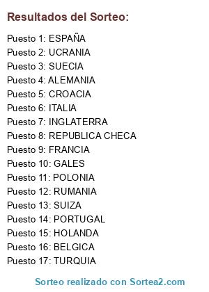 Lista de participantes: POLONIA, PORTUGAL, UCRANIA, ALEMANIA, INGLATERRA, ITALIA, GALES, HOLANDA, SUECIA, RUMANIA, FRANCIA, TURQUIA, CROACIA, BELGICA, ESPAÑA, SUIZA, REPUBLICA CHECA.