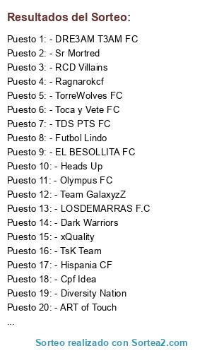 Lista de participantes: - Futbol Lindo, - Ragnarokcf, - FyfaLeagueFC, - TorreWolves FC, - DRE3AM T3AM FC, - Olympus FC, - TDS PTS FC, - Toca y Vete FC, - ART of Touch, - LOSDEMARRAS F.C, - Dark Warriors, - xQuality, - Team GalaxyzZ, - RCD Villains, - Hispania CF, - FreeStyle Squad, - Cpf Idea, - The Spain Stars, - EL BESOLLITA FC, - Sr Mortred, - Diversity Nation, - TsK Team, - Heads Up, - Sixth Sense.