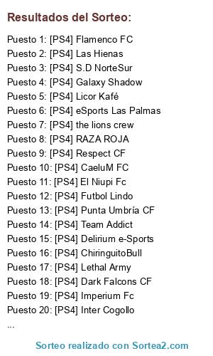 Lista de participantes: [PS4] Las Hienas , [PS4] ChiringuitoBull, [PS4] CaeluM FC, [PS4] Dark Falcons CF, [PS4] Valongo Rovers, [PS4] Futbol Lindo, [PS4] Team Addict, [PS4] Inter Cogollo, [PS4] Licor Kafé, [PS4] El Niupi Fc, [PS4] eSports Las Palmas , [PS4] Galaxy Shadow, [PS4] TacticalBoard, [PS4] the lions crew, [PS4] Respect CF, [PS4] Lethal Army, [PS4] Imperium Fc, [PS4] Punta Umbría CF, [PS4] Delirium e-Sports, [PS4] Inter Legends, [PS4] Flamenco FC, [PS4] S.D NorteSur, [PS4] RAZA ROJA, [PS4]Devil Cry.