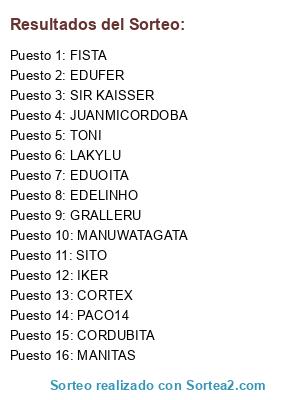 Lista de participantes: PACO14, CORTEX, TONI, FISTA, EDUOITA, IKER, CORDUBITA, JUANMICORDOBA, MANITAS, SIR KAISSER, SITO, MANUWATAGATA, EDELINHO, EDUFER, LAKYLU, GRALLERU.