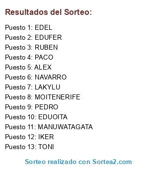 Lista de participantes: PACO, PEDRO, IKER, EDUOITA, MANUWATAGATA, EDEL, MOITENERIFE, RUBEN, EDUFER, LAKYLU, TONI, NAVARRO, ALEX.