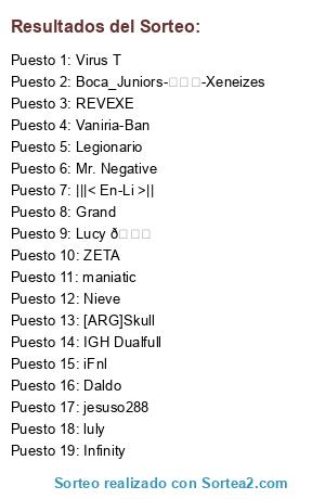 Lista de participantes: REVEXE, osbaldo peron gonzales , Nieve, [ARG]Skull , XxxkrazyxxX , [LMU] ßicho ZENGAMING.NET, Virus T , Gerflame , IGH [4rms? , IGH Dualfull , SniperChinesse , puma3086 , Mortui non mordent , Lucy 💖 , CSGORage.com Franco , Leonkiler , iFnl , jesuso288 , Infinity , Daldo , Boca_Juniors-★★★-Xeneizes , Akaris ® , maniatic , luly , Sm1th Baphomet , Pain , dAnIeL , Frostian_ , Jota, KillNotes , |||< En-Li >||, SiC.Zombie , Vino, Legionario, ZETA , -Sic_ , eLioni , Vaniria-Ban , XTASS [ARG] , 0z, Loky09 , ZliAle , Mr. Negative , Grand , Francis, The Survivor.