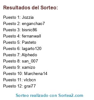 Lista de participantes: lagarto120, enganchao7, xamizo, Alphedo, bisnic86, Jozzia, Marchena14, Pasteto, vlcbcn, fernanwall, grai77, san_007.