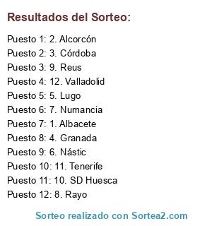 Lista de participantes: 1. Albacete, 2. Alcorcón, 3. Córdoba, 4. Granada, 5. Lugo, 6. Nástic, 7. Numancia, 8. Rayo, 9. Reus, 10. SD Huesca, 11. Tenerife, 12. Valladolid.