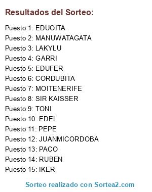 Lista de participantes: PACO, MANU, ALEX, PEDRO, TONI, JUANMICORDOBA, CORDUBITA, SAPINHO, RUBEN, EDUFER, IKER, MOITENERIFE.