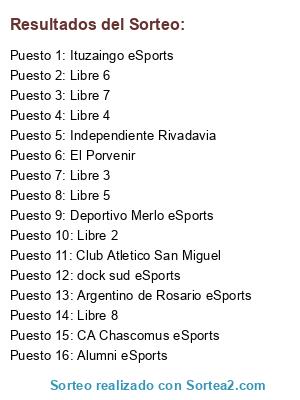 Lista de participantes: Club Atletico San Miguel, Libre 5, El Porvenir, Libre 3, Libre 4, Ituzaingo eSports, Libre 8, Independiente Rivadavia, Libre 6, CA Chascomus eSports, Argentino de Rosario eSports, Libre 7, Alumni eSports, dock sud eSports, Libre 2, Deportivo Merlo eSports.