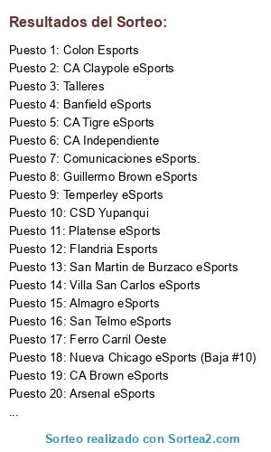Lista de participantes: CA Independiente, All Boys eSports, CA Huracan Esports, Flandria Esports, CSD Yupanqui, San Telmo eSports, CA Brown eSports, CA Claypole eSports, Club Deportivo Moron., San Martin de Burzaco eSports, AAAJ eSports, Quilmes A.C, Guillermo Brown eSports, Talleres, Comunicaciones eSports., Nueva Chicago eSports (Baja #10), Acassuso eSports, Platense eSports, CA Tigre eSports, Arsenal eSports, Colon Esports, Gimnasia La Plata, Godoy Cruz eSports, Banfield eSports, Estudiantes rio4 esports, Ferro Carril Oeste, Temperley eSports, Almagro eSports, Midland eSports, Douglas eSport, Villa San Carlos eSports, Chacarita jrs esports.
