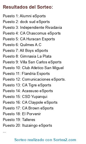 Lista de participantes: Ituzaingo eSports, Club Atletico San Miguel, El Porvenir, Independiente Rivadavia, Deportivo Merlo eSports, dock sud eSports, Argentino de Rosario eSports, Alumni eSports, CA Claypole eSports, Talleres, CA Tigre eSports, Comunicaciones eSports., CSD Yupanqui, Flandria Esports, Villa San Carlos eSports, San Telmo eSports, CA Chascomus eSports, CA Brown eSports, CA Huracan Esports, Acassuso eSports, Quilmes A.C, Estudiantes rio4 esports, All Boys eSports, Gimnasia La Plata.