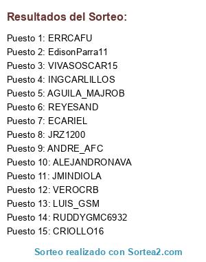 Lista de participantes: INGCARLILLOS, AGUILA_MAJROB, VIVASOSCAR15, EdisonParra11, JRZ1200, JMINDIOLA, VEROCRB, CRIOLLO16, RUDDYGMC6932, ERRCAFU, ALEJANDRONAVA, REYESAND, ECARIEL, ANDRE_AFC, LUIS_GSM.