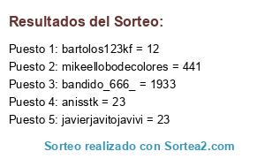 Lista de participantes: mikeellobodecolores = 441, bandido_666_ = 1933, anisstk = 23, bartolos123kf = 12, javierjavitojavivi = 23.