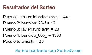 Lista de participantes: mikeellobodecolores = 441, bandido_666_ = 1933, anisstk = 23, bartolos123kf = 12, javierjavitojavivi = 23.