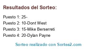 Lista de participantes: 1-Jack Ruself, 2-Morgan Schweitzer, 3-Mark Houston, 4-Matias Hextech, 5-Tracey Kaddish, 6-Morgan Schweitzer, 7-Alejo Ratell, 8-Victor Mclaughlin, 9-Tonny Queens, 10-Dont West, 11-Akiyama Tamashiro, 12-Yasser Kronsteiner, 13-Jordy Drake, 14-Lautaro Auschwitz, 15-Mike Berserreti, 16-Evan Buckton, 17-Bertholdt Eckhart, 18-, 19-, 20-Dylan Payne, 21-, 22-, 23-, 24-Jozsef Vrsaljko, 25-, 26-, 27-, 28-, 29-Llerato flowers, 30-Kennedith Daugherty.