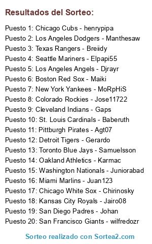 Lista de participantes: Detroit Tigers - Gerardo, Los Angeles Dodgers - Manthesaw, Pittburgh Pirates - Agt07, Boston Red Sox - Maiki, Colorado Rockies - Jose11722, Toronto Blue Jays - Samuelsson, Seattle Mariners - Elpapi55, St. Louis Cardinals - Baberuth, Los Angeles Angels - Djrayr, Texas Rangers - Breiidy, New York Yankees - MoRpHiS, Washington Nationals - Juniorabad, Chicago White Sox - Chirinosky, Cleveland Indians - Gaps, Miami Marlins - Juan123, San Diego Padres - Johan, Oakland Athletics - Karmac, Kansas City Royals - Jairo08, Chicago Cubs - henrypipa, San Francisco Giants - wilfredozr.