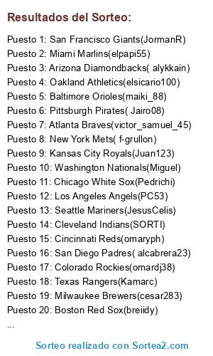 Lista de participantes: Arizona Diamondbacks( alykkain), Atlanta Braves(victor_samuel_45), Baltimore Orioles(maiki_88), Boston Red Sox(breiidy), Chicago White Sox(Pedrichi), Cincinnati Reds(omaryph), Cleveland Indians(SORTI), Colorado Rockies(omardj38), Detroit Tigers(jose11722), Kansas City Royals(Juan123), Los Angeles Angels(PC53), Miami Marlins(elpapi55), Milwaukee Brewers(cesar283), New York Mets( f-grullon), New York Yankees(Venecojr), Oakland Athletics(elsicario100), Pittsburgh Pirates( Jairo08), San Diego Padres( alcabrera23), San Francisco Giants(JormanR), Seattle Mariners(JesusCelis), St. Louis Cardinals(simonrm), Tampa Bay Rays(henrypipa), Texas Rangers(Kamarc), Washington Nationals(Miguel).