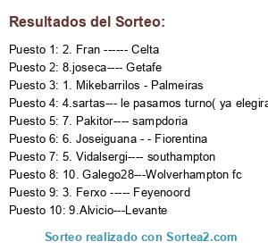 Lista de participantes: 1. Mikebarrilos - Palmeiras, 2. Fran ------ Celta, 3. Ferxo ----- Feyenoord, 4.sartas--- le pasamos turno( ya elegira cuando lo lea), 5. Vidalsergi---- southampton, 6. Joseiguana - - Fiorentina, 7. Pakitor---- sampdoria, 8.joseca---- Getafe, 9.Alvicio---Levante, 10. Galego28---Wolverhampton fc.