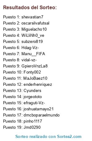 Lista de participantes: pinho1117, GpieroVnzLa8, subzero819, Jmd0290, Fonty002, oscarsilvafutsal, Manu__FIFA, Cyunders, vidal-vz-, Hdag-Vz-, efraguti-Vz-, enderhenriquez, shevastian7, dmcboparaelmundo, MaJoBaez10, jorgeototo, WiLliNh0_ve, Miguelacho10, joshuatamayo21.