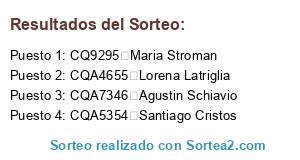 Lista de participantes: CQ0008 Alexis Ferrara, CQ0010 Cecilia Mantovano, CQ0020 Hernan Guinzburg, CQ0022 Silvia Sanchez, CQ0023 Marta Monacci, CQ0029 Stella Boudin, CQ0033 Eduardo Alejandro Barrio, CQ0042 Maria Lujan Arguelles, CQ0053 Oscar Chinni, CQ0087 Manuel Gonzalez, CQ0089 Jose Luis Bugarin Diaz, CQ0091 Noelia Primolini, CQ0100 Carolina Tencaioli, CQ0106 Martin Paz, CQ0110 Leonor Arditti, CQ0115 Paola Maurizio, CQ0118 Fiorella Stephania, CQ0123 María Victoria Gómez Frugoni, CQ0127 Noelia Sorba, CQ0130 Emiliano Lambrecht, CQ0132 Gabriela Pichersky, CQ0138 Normando Birolo, CQ0157 Gaston Adolfo, CQ0161 Alejandro Viton, CQ0165 Edgardo Alvarez, CQ0172 Marcela Martinez, CQ0174 Cecilia Villegas, CQ0175 Rodolfo Bosco, CQ0176 Ivan Schuszter, CQ0184 Tais Ambrosio, CQ0187 Doris Rodriguez Vidal, CQ0201 Ernesto Gabriel Mazzola, CQ0204 Sofia Morseletto, CQ0223 Ricardo Mazzola, CQ0226 Marcelo Varela, CQ0229 Fernanda Garcia, CQ0232 Leandro Kanemann, CQ0246 Maria Susana Marino, CQ0255 Adriana Manetti, CQ0258 Jimena Mastrangelo, CQ0260 Victoria Soroa, CQ0268 Pablo Brancatella, CQ0274 Jose Maria Prieto, CQ0310 Carola Burgin, CQ0314 Agustin Bonadeo, CQ0317 Carolina Crovetto, CQ0323 Monica Laura dias, CQ0328 Maria del Carmen Lescano de Gonzalez, CQ0334 Veronica Blanchet, CQ0338 Susana Gamio, CQ0360 Dolores Vallverdu, CQ0366 Lautaro Gonzalez, CQ0374 Mariela Schaer, CQ0381 Daniela Migliore, CQ0396 Carlos Bonazzola, CQ0398 Silvana Quattrocchi, CQ0409 Nicolas Armenti, CQ0412 Marilina Lipsman, CQ0431 Nora Liliana Melillo, CQ0441 Adriana Sanchez, CQ0454 Noemi Santamaria, CQ0462 Carina Pasut, CQ0466 Deborah Caruso, CQ0481 Matías Cassani Laham, CQ0483 Javier ( Jimena Alonso ), CQ0488 Carolina Coto, CQ0490 Patricia Salerni, CQ0501 Maximiliano Benitez, CQ0507 Javier Leonel Cassani Laham, CQ0508 Jorge Luciano Gorini, CQ0509 Osvaldo Betti, CQ0514 Matias Lopez, CQ0533 Hector Costanzo, CQ0561 Janice Melisa Ricco, CQ0562 Federico Gimenez Molinelli, CQ0572 Mariano Vignart, CQ0575 María Cristina Mendez de Panzuto, CQ0583 Florencia Vodanovich, CQ0595 María Virginia Benavente /Juan Manuel Terradas, CQ0598 Gabriela Pidal, CQ0616 Antonella Prigioniero, CQ0619 Lucas Lopez, CQ0630 Miguel Irazustabarrena, CQ0637 SORAYA GNATIUK, CQ0641 Mirta Reyna, CQ0651 Viviana Ines Menendez Bilous, CQ0652 Daniel Chattas, CQ0656 Horacio Barberis, CQ0657 Bruno de Simone, CQ0670 ANA CAMPA DE PESCE, CQ0682 Gabriel Garcia, CQ0684 Osvaldo Fernandez, CQ0688 Carolina Scaccia, CQ0694 Nadia Mazzeo, CQ0709 Facundo Batih Mahon, CQ0710 Maxi Trotta, CQ0720 Maria Silvia Lateana, CQ0747 Adriana Chamorro, CQ0749 Javier Farulla, CQ0754 Francisco Marcos Carnevali, CQ0756 Maximiliano Priore(2 participaciones), CQ0759 Diego Fernando Mari(2 participaciones), CQ0760 Victoria Asencio, CQ0776 Ernesto Serrano, CQ0787 Pablo Berra, CQ0791 Ezequiel Bordoli, CQ0794 Vanesa Fandiño, CQ0807 Pablo Belenky, CQ0812 Mariana Hirsch, CQ0820 Beatriz Piacentini, CQ0821 Maria Fernanda Mena, CQ0835 Mariano Goldberg, CQ0843 Federico Obrutsky, CQ0844 Fernando Ariel Casais, CQ0850 Manuel Arrambide, CQ0856 Diego Lorenti, CQ0860 Paola Ratti, CQ0879 Cecilia Lanús Ocampo, CQ0880 Juan San Miguel, CQ0895 Roberto Daniel Murmis / Max, CQ0900 Ricardo Bustos, CQ0904 Guadalupe Alba Benitez, CQ0913 Soledad Verdinelli, CQ0935 Sebastián Bonuccelli, CQ0953 Patricio Pascual, CQ0954 Marisol Vazon, CQ0955 Maria Alejandra Papazoglu, CQ0960 Margarita Gramajo, CQ0967 Martin Regueiro, CQ1005 Marta Mareco, CQ1007 Santiago Ginnobili(2 participaciones), CQ1016 Pedro Gimenez Molinelli, CQ1019 Elena Gradel, CQ1025 Sebastian Tarantini, CQ1028 Lautaro Veliz Espeche, CQ1032 Susana C. Borojovich, CQ1047 Pilar Martinez, CQ1049 Gustavo Cohen, CQ1052 Cesar Ivan Altolaguirre, CQ1058 Alejandro Paltrinieri, CQ1084 Mario Martinelli, CQ1088 Luis Monti, CQ1094 Ariel Perczyk, CQ1105 Javier E. Dulce, CQ1106 Diego R. Alvarez, CQ1110 María Angélica Suarez, CQ1112 Romina Iris Camaratta, CQ1114 Betania Marquez, CQ1145 Fernando Russ, CQ1146 Miguel Haase, CQ1148 Manuel Perez Williams, CQ1153 Norberto Nenninger, CQ1159 Martin Reyna, CQ1170 Joaquin Ulloa, CQ1176 Matias Szeftel, CQ1182 Diego Goldman, CQ1188 Miranda Mougenot Mohorade, CQ1199 Efrain Carvajal, CQ1200 Paula Moretti, CQ1202 Mariana Angela Terradas, CQ1204 Matias Iskowitz, CQ1205 Alejandra Tonina, CQ1224 Ana Maria Murua, CQ1250 Maria Belen Piedrabuena(2 participaciones), CQ1258 Gerardo Brandariz, CQ1270 Douglas Peña, CQ1276 Elsa Adriana Ortiz, CQ1294 Ignacio Javier Gonzalez, CQ1300 Francisco Bartolomé, CQ1329 Mariano Lopez, CQ1338 Cristian Sosa, CQ1345 Esteban Travelletti, CQ1348 Pablo Piazza, CQ1368 Maria Laura Benitez, CQ1370 Patricio Delfosse / Ximena, CQ1371 Olivia A Stanfield, CQ1374 Facundo Santacapita, CQ1384 Nicolas Cobasky, CQ1394 Julio Contino, CQ1397 Marcela Minafro, CQ1424 Susana D Ambrosio, CQ1433 Rodolfo Gonzalez Lebrero, CQ1434 Pablo Clarembaux, CQ1439 Javier Fernández, CQ1450 Fabián Repetto, CQ1467 David Salischiker, CQ1468 Sergio Borisonik, CQ1472 Pamela Gionco, CQ1473 Marcelo Carballa, CQ1486 Aldo Romano, CQ1488 Jose Luis Campanello, CQ1501 Veronica Kapelusznik, CQ1503 Alejandro Rudman, CQ1522 Santiago Palladino, CQ1526 Gustavo Casartelli, CQ1532 Mariana Sanchez, CQ1537 Tomas scasso, CQ1570 Leandro Tolosa, CQ1575 Luis Alberto Acebal, CQ1591 Carolina Aulicino, CQ1593 Marco Ferraro, CQ1594 Candela Vidal, CQ1608 Myriam Mazzini Baez, CQ1627 Enrique Omar Fernandez, CQ1645 Emmanuel Rodrigo Vichi, CQ1654 Gastón Bojorge, CQ1658 Julia Salomon, CQ1668 Claudia Ziliotto, CQ1688 Jaime Gotlib, CQ1692 Ana Salina, CQ1694 Solange Francois, CQ1697 Facundo Medurga, CQ1710 Matias Lazzaro, CQ1714 Javier Cohen, CQ1721 María Alejandra Rafael, CQ1729 Hugo Ceferino Spettel, CQ1730 Andres Glavina, CQ1751 Jorge Giménez, CQ1759 Esteban Secondi, CQ1767 Alejandro Buosi, CQ1786 Martin Cordischi, CQ1789 Felipe Carvajal, CQ1793 Jose Morales (recibe Angelismar), CQ1807 Roberto Garcia Eleisequi, CQ1814 Silvia Graciela Ramos(2 participaciones), CQ1819 Fernando Tobares García