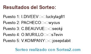 Lista de participantes: M.DEPAY - aemepoam, G.BUFFON - aemepoam, MARCO_ASENSIO - aemepoam, GELSON_MARTINS - aemepoam, C.SMALLING - aemepoam, BADOU_NDIAYE - aemepoam, J.IKONE - aemepoam, A.MUSA - aemepoam, RUBEN_PEREZ - aemepoam, MARCOS_ROCHA - aemepoam, S.PADT - aemepoam, S.OKAKA - aemepoam, A.GRAY - aemepoam, A.BIYOGO_POKO - aemepoam, P.RETSOS - aemepoam, KIKO_OLIVAS - aemepoam, S.JOHANSEN - aemepoam, R.COLY - aemepoam, MURILO - aemepoam, J.RASMUSSEN - aemepoam, L.GORETZKA - alabuliee, K.SCHMEICHEL - alabuliee, A.RUDIGER - alabuliee, RAFA_SILVA - alabuliee, C.WILSON - alabuliee, A.MANDI - alabuliee, DJANINY - alabuliee, S.JOVETIC - alabuliee, M.CASCO - alabuliee, A.JAHANBAKHSH - alabuliee, D.BOUANGA - alabuliee, T.DAVIES - alabuliee, K.LAIFIS - alabuliee, A.FERNANDEZ - alabuliee, O.ELABDELLAOUI - alabuliee, D.VALDES - alabuliee, A.IONOV - alabuliee, LEKUE - alabuliee, S.BASTIEN - alabuliee, RODRI - andres91, L.TORREIRA - andres91, F.ARMANI - andres91, J.LINGARD - andres91, H.RODALLEGA - andres91, M.SAKHO - andres91, P.HERNANDEZ - andres91, A.RICAURTE - andres91, A.DALESSANDRO - andres91, E.BERISHA - andres91, TIAGO_PINTO - andres91, H.ARSLAN - andres91, O.IGHALO - andres91, P.CAPELLE - andres91, L.AUGUSTINSSON - andres91, A.CHAHECHOUHE - andres91, A.SORLOTH - andres91, OSVALDO - andres91, PEDRO_HENRIQUE - andres91, I.IGNATYEV - andres91, L.POCRNJIC - andres91, J.FJOLUSON - andres91, N.SANGARE - andres91, S.MUWASHAR - andres91, D.MERTENS - burgui1985, ALLAN - burgui1985, X.SHAQIRI - burgui1985, L.HRADECKY - burgui1985, M.DEMBELE - burgui1985, C.VARGAS - burgui1985, F.GRILLITSCH - burgui1985, N.ARAUJO - burgui1985, B.ENGELS - burgui1985, S.SANOGO - burgui1985, M.YOSHIDA - burgui1985, K.T.CATHERINE - burgui1985, WILLIAN_ARAO - burgui1985, T.KONGOLO - burgui1985, D.STEPHENS - burgui1985, P.MARTINEZ - burgui1985, WILLIAM_POTTKER - burgui1985, B.POULAIN - burgui1985, KAHRABA - burgui1985, J.BOSTOCK - burgui1985, A.DIAKHABY - burgui1985, M.MAOLIDA - burgui1985, L.BURIAN - burgui1985, M.MOROZIUK - burgui1985, J.RODRIGUEZ - drekon88, K.NAVAS - drekon88, D.ALLI - drekon88, J.MATIP - drekon88, R.QUARESMA - drekon88, S.NZONZI - drekon88, L.OCAMPOS - drekon88, G.DEFREL - drekon88, M.LOPEZ - drekon88, A.MASIELLO - drekon88, RAPHINHA - drekon88, J.LEDESMA - drekon88, G.ACOSTA - drekon88, J.IZQUIERDO - drekon88, CHIQUINHO - drekon88, ELKESON - drekon88, REINALDO - drekon88, C.DEPRES - drekon88, S.PARSHIVLYUK - drekon88, A.MINA - drekon88, IAGO_ASPAS - edu101119, H.MAGUIRE - edu101119, I.GUEYE - edu101119, K.HAVERTZ - edu101119, ODRIOZOLA - edu101119, DIEGO_ALVES - edu101119, LJ.FEJSA - edu101119, E.BAILLY - edu101119, S.VERDI - edu101119, Z.FEDDAL - edu101119, DANIEL_PODENCE - edu101119, DANI_OLMO - edu101119, CARLES_ALE?A - edu101119, WENDEL - edu101119, M.STOCH - edu101119, GABRIEL_SILVA - edu101119, S.GUIRASSY - edu101119, J.KLUIVERT - edu101119, L.ADVINCULA - edu101119, F.KUDRYASHOV - edu101119, B.PAVARD - elfus21, N.PEPE - elfus21, N.KEITA - elfus21, M.AKANJI - elfus21, M.RASHFORD - elfus21, PEPE_REINA - elfus21, M.LANZINI - elfus21, K.LALA - elfus21, D.BERARDI - elfus21, RENATO_AUGUSTO - elfus21, N.MAKSIMOVIC - elfus21, G.CLICHY - elfus21, J.HERNANDEZ - elfus21, N.VIERGEVER - elfus21, E.MAS - elfus21, A.TAMEZE - elfus21, D.MORENO - elfus21, BRUNO_GONZALEZ - elfus21, M.ROJAS - elfus21, D.JANMAAT - elfus21, G.IMBULA - elfus21, YOEL - elfus21, C.IMMOBILE - Hts_Sergi92, J.GIMENEZ - Hts_Sergi92, RICHARLISON - Hts_Sergi92, FELIPE_ANDERSON - Hts_Sergi92, A.CORREA - Hts_Sergi92, DANILO_PEREIRA - Hts_Sergi92, B.ANDRE - Hts_Sergi92, J.ANDERSEN - Hts_Sergi92, V.RONGIER - Hts_Sergi92, N.LOPEZ - Hts_Sergi92, D.STURRIDGE - Hts_Sergi92, WEVERTON - Hts_Sergi92, M.SELS - Hts_Sergi92, A.HAKIMI - Hts_Sergi92, N.PASQUINI - Hts_Sergi92, A.BLIN - Hts_Sergi92, C.MUSONDA - Hts_Sergi92, U.COSIC - Hts_Sergi92, F.MLADENOVIC - Hts_Sergi92, S.POPOV - Hts_Sergi92, R.EVGENYEV - Hts_Sergi92, A.KUTUCU - Hts_Sergi92, T.WERNER - ispro19, M.BENATIA - ispro19, W.ZAHA - ispro19, W.KANNEMANN - ispro19, L.PRATTO - ispro19, N.NANDEZ - ispro19, O.ABDULRAHMAN - ispro19, A.YOUNG - ispro19, F.DELPH - ispro19, A.DIAWARA - ispro19, A.BABA - ispro19, M.GUENDOUZI - ispro19, S.MORRISON - ispro19, J.CUADRADO - ispro19, C.ATSU - ispro19, L.LANDRE - ispro19, CHEMA - ispro19, M.SIMON - ispro19, B.PERLAZA - ispro19, NUNO_TAVARES - ispro19, A.LECOMTE - ispro19, WILLIAN - jjose, J.HENDERSON - jjose, G.SIGURDSSON - jjose, PEPE - jjose, GABRIEL_PIRES - jjose, ALEX_GRIMALDO - jjose, Y.BOUNOU - jjose, I.SARR - jjose, A.ROMAO - jjose, A.AYEW - jjose, SANTI_MINA - jjose, S.BOCCHETTI - jjose, REVER - jjose, LUCAS_PEREZ - jjose, T.KRUL - jjose, E.FALKENBURG - jjose, J.GOMEZ - jjose, DAVID_COSTAS - jjose, E.STEVENS - jjose, DOUGLAS_COSTA - jonkor366, ALVARO_MORATA - jonkor366, G.LO_CELSO - jonkor366, K.STROOTMAN - jonkor366, D.BLIND - jonkor366, H.CALHANOGLU - jonkor366, E.MENDY - jonkor366, F.ANGILERI - jonkor366, PEDRO_ROCHA - jonkor366, HELDER_COSTA - jonkor366, O.COLLEY - jonkor366, L.GIANETTI - jonkor366, DIOGO_DALOT - jonkor366, T.MANGANI - jonkor366, K.GROSICKI - jonkor366, A.SMITH - jonkor366, KENAN_KODRO - jonkor366, G.LUX - jonkor366, C.CORVALAN - jonkor366, A.CERRI - jonkor366, B.MATUIDI - josepdabit, G.DONNARUMMA - josepdabit, V.KOMPANY - josepdabit, M.MANDZUKIC - josepdabit, Y.MVILA - josepdabit, JOSE_GAYA - josepdabit, M.ODEGAARD - josepdabit, M.DE_SCIGLIO - josepdabit, M.MAREGA - josepdabit, C.HERELLE - josepdabit, R.FREULER - josepdabit, L.DIMATA - josepdabit, G.BONG - josepdabit, P.GARCES - josepdabit, B.PETKOVIC - josepdabit, J.KODJIA - josepdabit, M.CAFARO - josepdabit, C.PATERSON - josepdabit, J.CHABOT - josepdabit, N.MATIC - kialema1, D.TADIC - kialema1, K.COMAN - kialema1, J.VARDY - kialema1, A.SAINT-MAXIMIN - kialema1, XAVI - kialema1, NALDO - kialema1, A.TOWNSEND - kialema1, S.SESSEGNON - kialema1, D.RANDOLPH - kialema1, M.DA_COSTA - kialema1, A.BARNES - kialema1, THIAGO_MAIA - kialema1, M.BELYAEV - kialema1, L.DIAZ - kialema1, I?IGO_COR