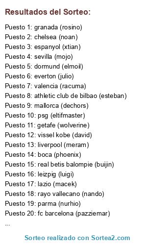 Lista de participantes: manchester united (fran), parma (nurhio), city (shaman), psg (eltifmaster), las palmas (rudyset), athletic club de bilbao (esteban), liverpool (meram), vissel kobe (david), rayo vallecano (nando), real oviedo (vene), osasuna (urko), fc barcelona (pazziemar), real betis balompie (buijin), atletico san luis de mexico (albervil), lazio (macek), dormund (elmoil), granada (rosino), everton (julio), chelsea (noan), real madrid (charly), new york city (isra), arsenal (clanis), sevilla (mojo), malaga (cristopher), leizpig (luigi), espanyol (xtian), newcastle (dubraik), boca (phoenix), leicester (parrita), mallorca (dechors), valencia (racuma), getafe (wolverine).