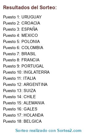 Lista de participantes: ALEMANIA, BRASIL, PORTUGAL, ARGENTINA, BELGICA, POLONIA, SUIZA, FRANCIA, CHILE, COLOMBIA, ESPAÑA, GALES, INGLATERRA, URUGUAY, ITALIA, CROACIA, HOLANDA, MEXICO.