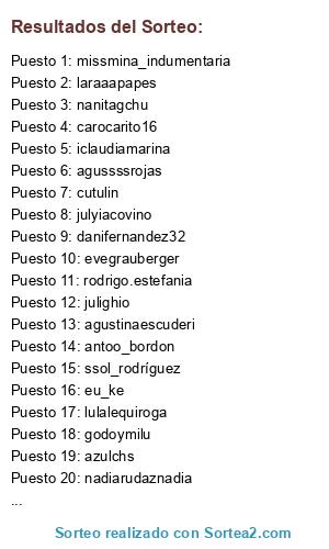 Lista de participantes: missmina_indumentaria, iclaudiamarina, eu_ke, agustinaescuderi, ssol_rodríguez, nadiarudaznadia, elianasolcorazza, agussssrojas, danifernandez32, cutulin, lulalequiroga, rodrigo.estefania, nanitagchu, laraaapapes, julighio, godoymilu, antoo_bordon, evegrauberger, julyiacovino, carocarito16, azulchs.