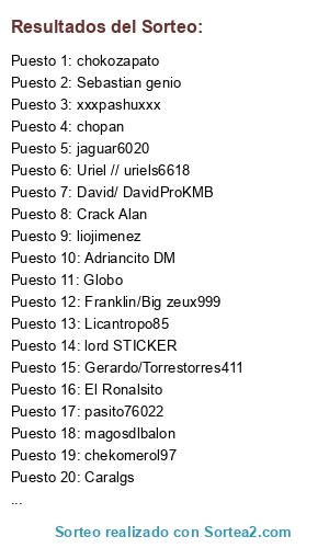 Lista de participantes: Xagu2015, Fede-vidi-vici, Atdi-Arcarsenal, Palancadeoro, Bambino_578, Joshua110895, Tico_DragonYT, E9goleador.