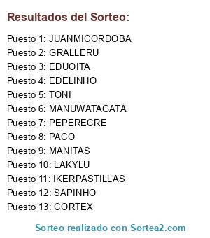 Lista de participantes: PACO, TONI, CORTEX, JUANMICORDOBA, PEPERECRE, LAKYLU, SAPINHO, EDUOITA, IKERPASTILLAS, MANUWATAGATA, MANITAS, EDELINHO, GRALLERU.