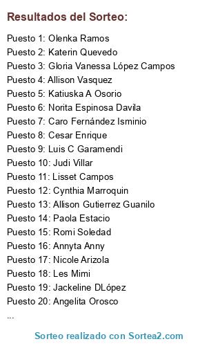 Lista de participantes: Isabel Sánchez Jara(2 participaciones), Nicole Arizola(2 participaciones), Lisset Campos(2 participaciones), Joanny OC, Jessica León(2 participaciones), Allison Gutierrez Guanilo(2 participaciones), Katiuska A Osorio(2 participaciones), Ivonne Carlos(2 participaciones), Jackeline DLópez, Aimée Lorraine(2 participaciones), Olenka Ramos(2 participaciones), Rosa Perez(2 participaciones), Paola Martinez Arteaga(2 participaciones), Nathaly Benavides Figueroa, Judi Villar(2 participaciones), Ornella Atenas Vivanco Solis(2 participaciones), Kimberly Bernuy Salazar(2 participaciones), Les Mimi(2 participaciones), Marly ML PC(2 participaciones), MaJanet Salazar D Peralta, Romi Soledad(2 participaciones), Karla Esthefany Medina Armas(2 participaciones), Erika Roxana Hinostroza Leguia(2 participaciones), Katerin Quevedo(2 participaciones), Luis C Garamendi(2 participaciones), Gabriela Milon Flores(2 participaciones), Roxana Mariela Cochachin(2 participaciones), Miriam Cantorin Paredes(2 participaciones), Rocio Milagros Mejia Rojas, Yunely Cordova Mejía(2 participaciones), Paloma Valqui Andrade(2 participaciones), Irma Rosa Urquiaga Vargas de Mariñas, Natalie Liseth, Maritza Olivares(2 participaciones), Yulia SP(2 participaciones), Allison Vasquez, Sergio Castillón Zapata, Rocio Ramirez(2 participaciones), GraCe Suarez Sànchez(2 participaciones), Cecilia Torres, Angelita Orosco(2 participaciones), Patty Urbina BEramendi(2 participaciones), Paola Estacio(2 participaciones), Norita Espinosa Davila(2 participaciones), Alonso López Leandro, Cynthia Marroquin(2 participaciones), Monica Huerta(2 participaciones), Angelica Veronica Guevara Burgos(2 participaciones), Maria Ines Del Carpio Michue, Ijmc Mi Vida(2 participaciones), Cesar Enrique(2 participaciones), Caro Fernández Isminio(2 participaciones), Ysa Urquizo, Verónica Milagros López(2 participaciones), Marianella Toribio(2 participaciones), Jannet Gisella Huisa(2 participaciones), Luz Cabada Bonilla, Andrea Carolina Guillén Ayala(2 participaciones), Gloria Vanessa López Campos(2 participaciones), Annyta Anny(2 participaciones).