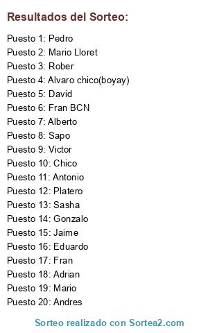 Lista de participantes: Antonio, Gonzalo, Fran, Alberto, Andres, Pedro, Jaime, Adrian, David, Eduardo, Platero, Alvaro chico(boyay), Chico, Rober, Sasha, Mario Lloret, Fran BCN, Sapo, Victor, Mario.
